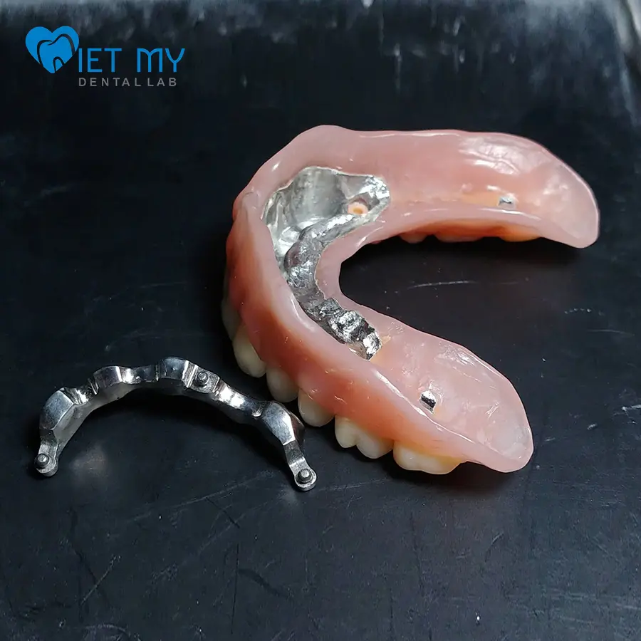 - Được nâng đỡ bởi implant, giúp tăng độ vững chắc so với hàm tháo lắp thông thường.
