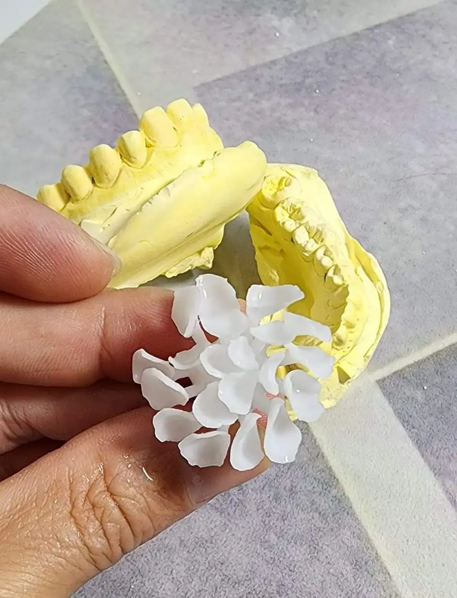 Verneer hoàn thiện (thường có độ dày từ 0,3 – 0,5 mm) được dán lên mặt ngoài của răng bằng keo dán chuyên dụng nha khoa.